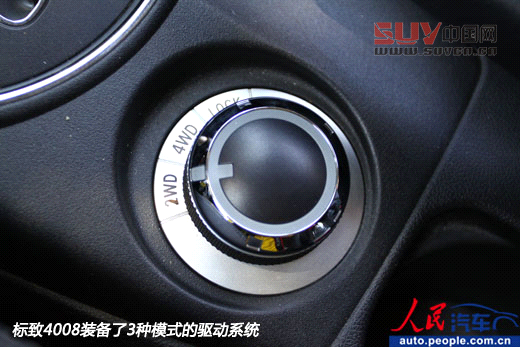 標致4008裝備了3種模式的驅動系統,2WD(前輪驅動)適合于城市行車,4WD會根據路面狀況自動分配前后軸驅動力,前輪最多可分配85%的動力,后輪則可達到55%。在LOCK模式下后輪的扭矩最多可達75%,可以應付雨雪、沙石和泥濘等路況,也可以輕松面對普通的越野路段。