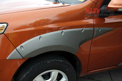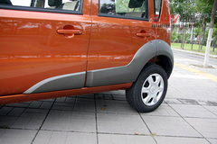 在車身側(cè)面,零散吸貼在輪眉、車門底部的大包圍,配以前后護(hù)板裝飾,使整車極具動態(tài)感官,進(jìn)一步強化了運動風(fēng)格。前輪眉像飛翔的翅膀,使整車有振翅欲飛的感覺,彎刀式的后輪眉,與前輪眉遙相呼應(yīng),時尚而動感。