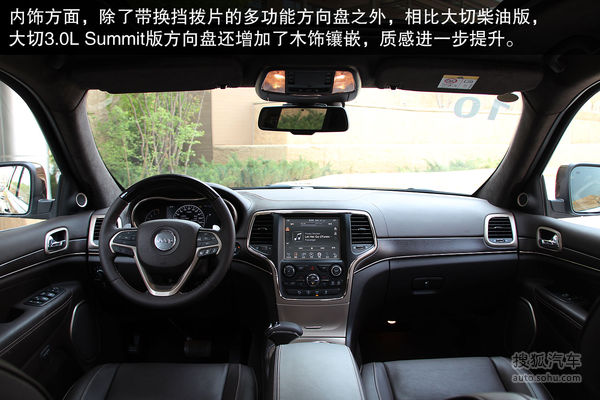 另外,本次試駕活動(dòng)中還有一款車值得注意,那就是大切諾基3.0L Summit旗艦尊悅版車型(下文統(tǒng)稱為大切3.0L Summit)??梢哉f其為3.0L車型的頂配版,動(dòng)力上與之前我們?cè)囻{的3.0L舒享導(dǎo)航版并無差別(點(diǎn)擊查看3.0L舒享導(dǎo)航版試駕文章),本篇不再贅述,更多的讓我們來看看這款3.0L旗艦車型在配置方面的一些亮點(diǎn)吧。