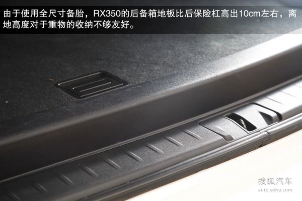 由于使用了全尺寸的備胎,雷克薩斯RX的后備箱地面并不與后保險杠處于同一水平面,大概有10CM左右的突起,對于沉重物品顯得不那么友好。后排4/6放倒也已經是所有車型的標準配置,放倒后的后排與后備箱的地板水平,這點非常贊。后排使用的情況下后備箱的容積達到了375L,而放倒后排后容積增加至754L,即使是在SUV中數據也十分搶眼。