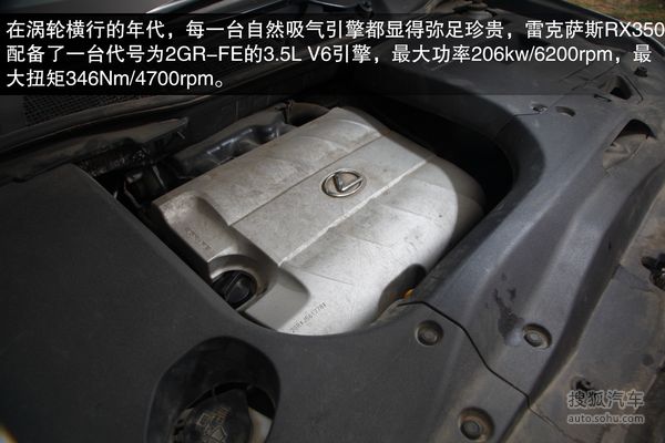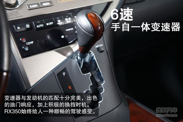 在渦輪增壓引擎大行其道的今天,大排量自然吸氣本身就顯得彌足珍貴。雷克薩斯RX350配備了一臺代號為2GR-FE的3.5L V6引擎,最大功率206kw/6200rpm,最大扭矩346Nm/4700rpm。賬面數據上肯定沒有那些帶T的車型搶眼,但輸出的平順性值得稱道。它與6速手自一體變速箱一起,帶來了十分舒暢的駕駛體驗。