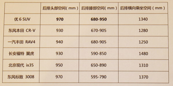 前面已經和大家介紹過,納智捷優6 SUV的軸距在同級車型中具有明顯優勢,因此在內部駕乘空間方面自然也就更加理想。優6 SUV的后排腿部空間為680-950mm,相比同級競爭對手或多或少都要更寬敞一些,而頭部空間也達到了970mm,遠超過了CR-V、翼虎等對手們。