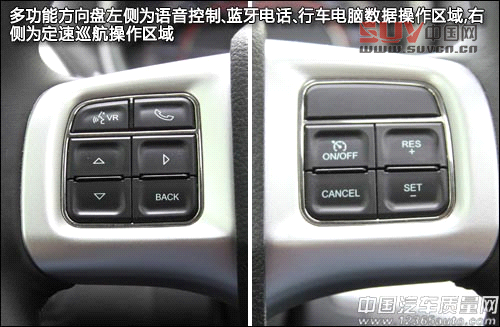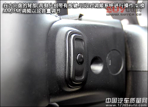 三幅式多功能方向盤,也采用了更多的時尚元素,整體風格依然保持著美式風格。而包裹緊致、針腳平整的真皮方向盤,配以銀色的盤幅作為裝飾,使整體質感得到了很大程度的提升。酷威的多功能方向盤帶有五大主要功能,可以操作音響系統、語音識別、藍牙電話、定速巡航功能,以及儀表顯示屏功能操作功能。在方向盤左側的操作按鈕,可以對語音識別、藍牙電話及儀表顯示屏功能進行操作;右側的按鈕可以操作定速巡航系統。有的朋友可能會問,如何操作音響多媒體系統呢,實際上它的操作按鍵隱藏在方向盤的背部。左右兩側分別帶有按鍵,可以切換AM/FM調頻,左側的上下按鍵可以調頻,右側的按鍵可以操控音量的大小。