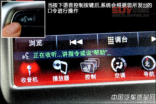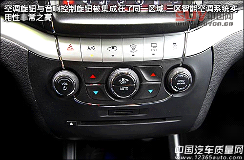 雖然眾多功能都可以通過大屏幕來進行操作,但必要的按鍵及旋鈕還是需要的。在屏幕的正下方,空調系統及音響調頻系統的按鍵、旋鈕被集成到了一起。兩側的旋鈕可以完成對音響系統進行關閉/開啟、調頻以及音量的控制,上面一排的按鍵區則集成了雙閃、空調功能、車身穩定系統按鍵。不要以為酷威的空調系統,猶如其操作按鍵一樣如此簡單,而是標配有三區自動空調系統,可以對主副駕及后排區域的溫度分別進行控制。
