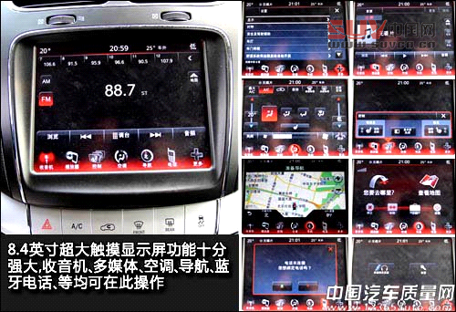 中控臺可以說是2013款酷威的一大特點,不同于其它車型,沒有了繁復的按鍵操作面板,所有功能都可以通過8.4英寸超大觸摸顯示屏進行操作。在這個功能強大的信息娛樂交互界面中,可選擇的功能有收音機調頻、多媒體播放器、座椅加熱控制、空調系統、導航、藍牙電話以及后排娛樂系統的開關,都可以在這一塊屏幕上輕松實現。此外,車輛功能的設定也可以通過這里來進行操作,例如車燈、門鎖、安全輔助等,個人認為這個屏幕已經“無敵”了。