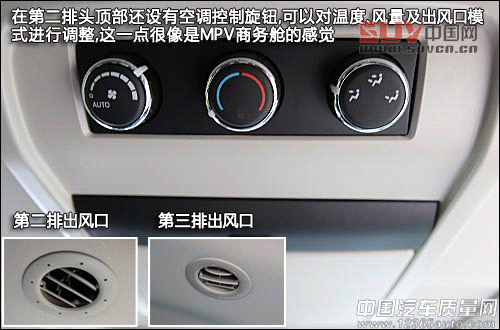 坐在后兩排的成員,不要擔心在炎炎夏日會享受不到徐徐涼風。三區空調在第二排頂部,帶有空調操作旋鈕,不光可以調節溫度,還可以調整風量及出風口模式,后兩排的頂部及腿部都分別帶有空調出風口,功能可謂十分強大。不光如此,在第二排座椅頂部的中間位置,還帶有可折疊的9英寸顯示屏,打開后內部帶有遙控器,可以像使用電視機一樣去進行操作,在漫長的旅途中,一家人看看電影、聽聽歌,可以想象這一刻其樂融融的溫馨場景。