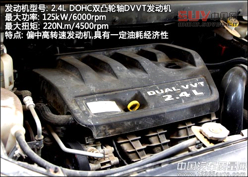 此次試駕的酷威,發動機為2.4L DOHC雙凸輪軸DVVT發動機,在6000rpm時最大功率為125kW,而在4500rpm時可以達到220Nm的最大扭矩。從這一點來看這款發動機有些偏中高轉速,而在轉速較低時的起步提速加速性,并不會太過于迅猛。需要加大油門后才會較為直接地感受到它的動力,畢竟這款車也并不是以宣揚運動性能為主的車型。如果您想體驗更為強勁的動力性能,可以考慮一下配備了3.6L pentastar高性能發動機的酷威,想必是另一種暢快的駕駛感覺。