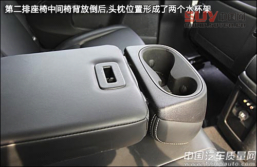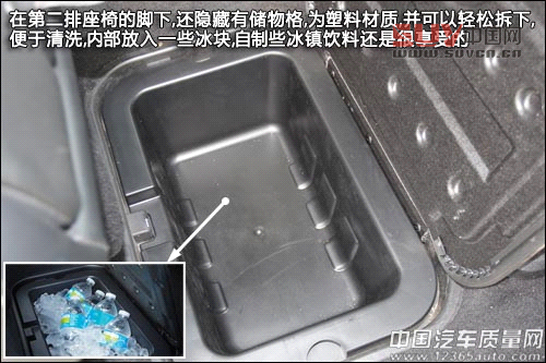 在第二排座椅的地板上,同樣帶有兩個儲物格,這就像變魔術一般,掀開地板后兩個寬大的儲物格便展現在眼前。起初我只是想方設法的盤算著,還有什么東西需要放在其內,但確實是不會享受生活,看到介紹后才恍然大悟!這讓兩個儲物格是可拆卸的,非常便于清洗。這樣的設計是為了冰鎮飲料,儲物格內部放入飲料后,撒上一些冰塊,天然的冰箱就展現在眼前,化掉的水可以輕松倒掉。我的天啊!美國人真的是很會享受啊!第二排座椅還帶有中央扶手設計,放倒后還帶有兩個水杯架,但并沒有多余的儲物空間,實際上也并不太需要了。