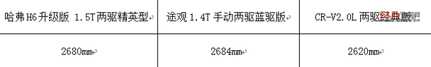 后排空間是許多人非常關注的方面,而決定后排空間的重要因素就是車輛軸距長短。途觀的軸距為2684mm,CR-V的軸距為2620mm,哈弗H6升級版為2680mm。途觀與哈弗旗鼓相當,CR-V則偏小。