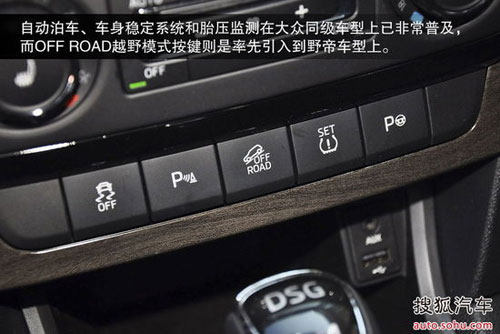 野帝高配車型多媒體系統為RNS315,擁有語音控制和導航系統。雙區自動空調布局是典型的大眾風格,高配車型帶有前排座椅加熱功能。自動泊車、車身穩定系統和胎壓監測在大眾同級車型上已非常普及,而OFF ROAD越野模式按鍵則是率先引入到野帝車型上。而手剎系統則還是采用機械式,這點上途觀的電子手剎則顯得更加方便。大面積的天窗自然是必不可少的裝備,可以為車內乘客帶來充分的采光。