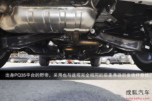 實拍的野帝搭載大家熟知的1.8TSI發動機,最大功率118kW,峰值扭矩250Nm,匹配的變速箱為6速DSG。后期將有可能增加一臺1.4TSI發動機的車型,發動機最大功率為96kW,峰值扭矩為220Nm,匹配的變速箱為7速DSG。出身PQ35平臺的野帝,采用也與途觀完全相同的前麥弗遜后多連桿懸掛。