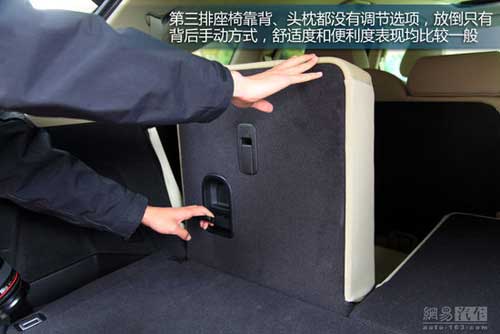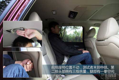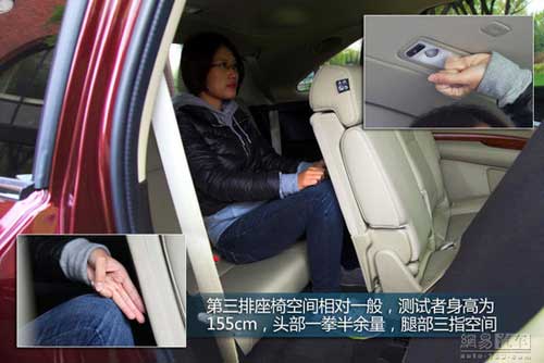由于第二排座椅無法做前后縱向的調整,第三排乘客的腿部空間只能鎖定在三指左右,頭部擁有一拳半左右余量。以測試者身高155cm的低標來看,最后一排只能適合那些身材相對嬌小的女生和小孩來乘坐。