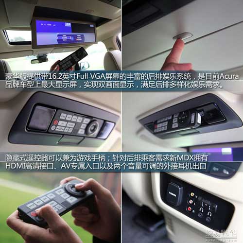 MDX豪華版提供后排16.2英寸Full VGA屏幕娛樂系統,該屏幕是謳歌目前所有車型中出現的最大尺寸的一體化屏幕,可實現左右雙屏分區功能化控制,充分滿足后排不同乘客的娛樂需求。該系統也包含了高清晰度多媒體接口(HDMI),可連接高清播放器和兼容游戲機以及標準的復合視頻和音頻(低配版本無此配置)。配合擁有12顆發音單元和主動降噪技術的ELS環繞立體聲音響系統(低配版本為11個喇叭),為乘客提供劇院級的娛樂享受。