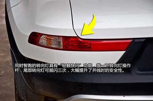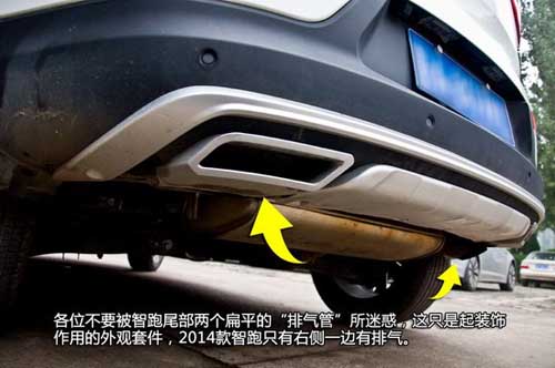 同時(shí)智跑的轉(zhuǎn)向燈具有“輕觸快閃”功能,撥一下轉(zhuǎn)向燈操作桿,尾部轉(zhuǎn)向燈可頻閃三次,大幅提升了并線(xiàn)時(shí)的安全性。從官網(wǎng)資料中了解到,2014款智跑2.0L Premium兩驅(qū),2.0L Premium Special兩驅(qū)和2.4L Premium還配置了同級(jí)SUV中比較個(gè)性和少見(jiàn)的迎賓激光燈。各位不要被智跑尾部?jī)蓚€(gè)扁平的“排氣管”所迷惑,這只是起裝飾作用的外觀套件,2014款智跑只有右側(cè)一邊有排氣,而且是圓形的排氣管。