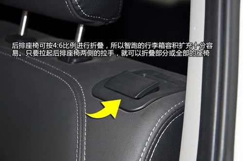 因?yàn)楹笈抛慰梢园凑?:6比例進(jìn)行折疊,所以智跑的行李箱容積擴(kuò)充十分容易。我們只需要拉起后排座椅兩側(cè)的拉手,就可以折疊部分或全部的座椅,這樣就可以裝載較大體積的行李或者物品。拉起行李箱的蓋板,大家可以看到智跑的隱藏式備胎。