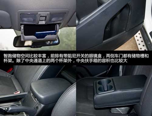 智跑的儲(chǔ)物空間還是比較豐富的,前排頂部有帶阻尼開(kāi)關(guān)的眼鏡盒,兩側(cè)車(chē)門(mén)都有儲(chǔ)物槽和杯架。其前排除了中央通道上的兩個(gè)杯架外,中央扶手箱的容積也比較大。該車(chē)的后車(chē)門(mén)雖然沒(méi)有儲(chǔ)物槽,但有杯架。在后排中央扶手上也設(shè)計(jì)有杯架。