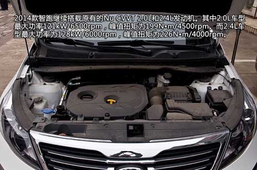 2014款智跑的動(dòng)力總成沒(méi)有變化,繼續(xù)搭載原有的Nu CVVT 2.0L和2.4L發(fā)動(dòng)機(jī)。其中2.0L車(chē)型的最大功率為121kW/6500rpm,峰值扭矩為199N·m/4500rpm。而2.4L車(chē)型的最大功率為128kW/6000rpm,峰值扭矩為226N·m/4000rpm。傳動(dòng)方面分別采用了6速手動(dòng)和6速手自一體變速箱。2014款智跑除了手動(dòng)擋車(chē)型外,自動(dòng)擋車(chē)型都配置有ECO節(jié)能駕駛提示。據(jù)官網(wǎng)資料顯示,2014款智跑6MT手動(dòng)車(chē)型工況油耗最低為7.8L,而6AT自動(dòng)擋車(chē)型最低油耗為7.9L。