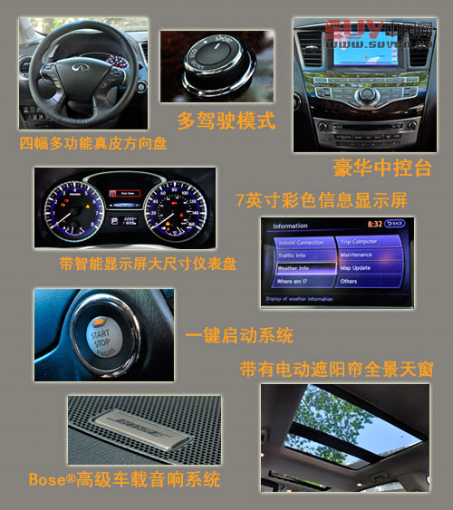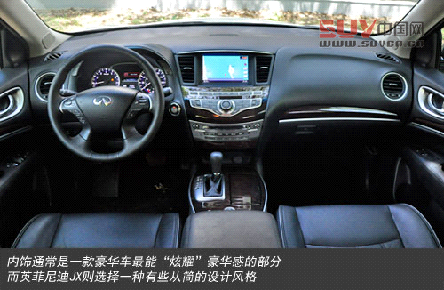 英菲尼迪JX采用了四幅方向盤(pán)設(shè)計(jì),無(wú)論從握感還是尺寸來(lái)說(shuō)都很符合東方人的需求,大量的多功能按鍵也沒(méi)有操作的繁雜感。黑底白字和藍(lán)色冷光組成了JX的儀表盤(pán)刻度,而中間位置信息顯示屏可顯示多項(xiàng)行車(chē)信息,并且可以顯示模擬影像。