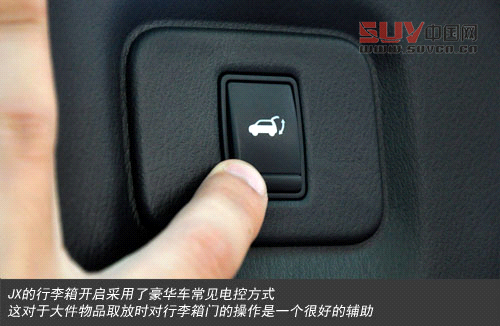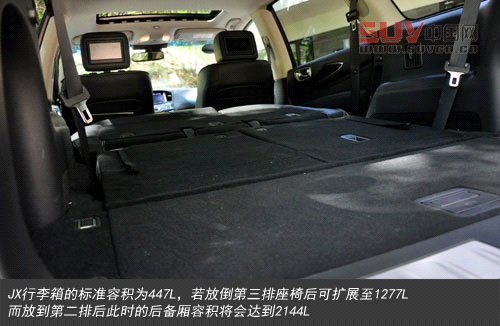 作為一款大型跨界SUV來(lái)說(shuō),JX的行李箱空間可以用出色來(lái)形容。其標(biāo)準(zhǔn)容積為447L,若放倒第三排座椅后可擴(kuò)展至1277L,而若要放置更多和更大的物件時(shí)還可再放倒第二排座椅,此時(shí)的后備廂容積將會(huì)達(dá)到2144L。此外,JX的行李箱開(kāi)啟采用了豪華車(chē)常見(jiàn)電控方式。