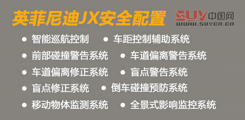 “安全屏障”,這是英菲尼迪JX在安全配置方面的一個(gè)代號(hào)性的名詞。英菲尼迪的“安全屏障”應(yīng)用多種主動(dòng)預(yù)防性技術(shù),以最大限度降低事故發(fā)生的風(fēng)險(xiǎn)。其包括全速段智能巡航控制、車(chē)距控制輔助系統(tǒng)等多項(xiàng)安全配置,而這些主動(dòng)安全系統(tǒng)均裝備于英菲尼迪JX車(chē)型上。
