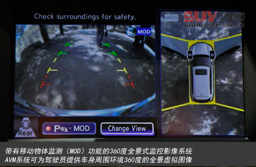 帶有移動(dòng)物體監(jiān)測(cè)(MOD)功能的360度全景式監(jiān)控影像系統(tǒng) (AVM)是英菲尼迪的另一個(gè)亮點(diǎn)配置,AVM系統(tǒng)可為駕駛員提供車(chē)身周?chē)h(huán)境360度的全景虛擬圖像,新的MOD對(duì)車(chē)輛周?chē)囊苿?dòng)物體進(jìn)行檢測(cè),并在虛擬圖像中發(fā)出視覺(jué)和聲音警告,使駕駛員全面清楚地了解周?chē)h(huán)境。該系統(tǒng)同時(shí)采用先進(jìn)的圖像處理技術(shù),當(dāng)車(chē)輛停駐時(shí),可檢測(cè)周?chē)囊苿?dòng)物體;在起動(dòng)或倒車(chē)時(shí),它可檢測(cè)到前方或后方的移動(dòng)物體。