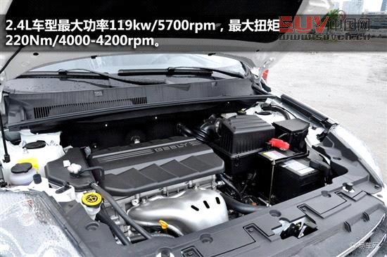 英倫SX7搭載的動力總成,分別為1.8L、2.0L和2.4L三種動力,1.8L發(fā)動機最大功率102KW/6200rpm,峰值扭矩172Nm/4200rpm;2.0L車型最大功率104KW/6000rpm,峰值扭矩178Nm/4000-4500rpm;2.4L車型最大功率119KW/5700rpm,最大扭矩220Nm/4000-4200rpm。1.8L和2.0L車型的傳動系統(tǒng)搭配5速手動變速箱,2.4L車型搭配6速手自一體變速箱。