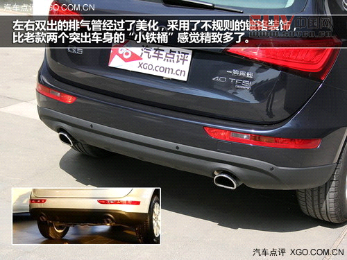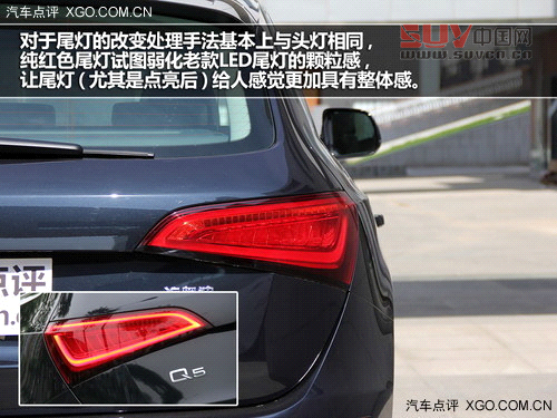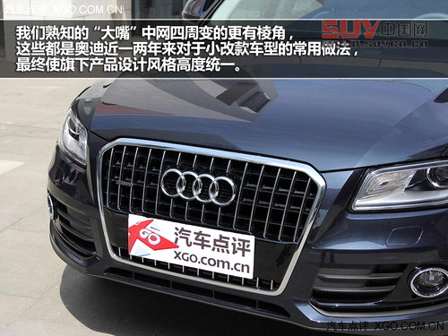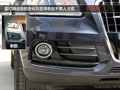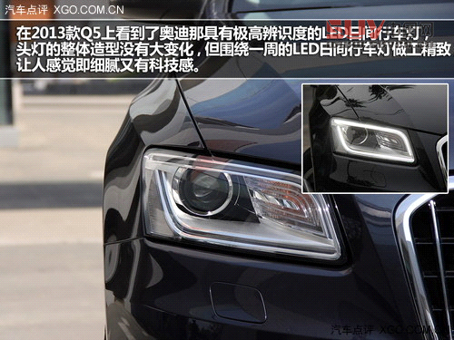 首先我們來看看2013款奧迪Q5在外觀方面做了哪些工作。“家族化”這個詞在之后的文章中會被多次提到,因為我們在2013款Q5上看到了奧迪那具有極高辨識度的LED日間行車燈,頭燈的整體造型沒有大變化,但圍繞一周的LED日間行車燈做工精致,讓人感覺即細膩又有科技感。雙光氙氣大燈、大燈清洗設(shè)備都是全系標配,只是我們這次試駕的入門級40TFSI進取型沒有自動大燈。