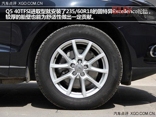 車身側(cè)面沒有大的變化,除了2013款新增的手動擋車型采用了17寸輪圈以外,其他車型都至少使用了18寸輪圈,像這臺40TFSI進取型就安裝了235/60R18的固特異Excellence輪胎,較厚的胎壁也能為舒適性做出一定貢獻。