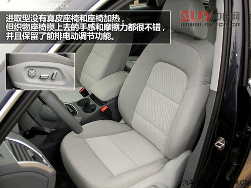 作為2013款最便宜的自動擋Q5,在配置方面肯定是要有些差異的,我們先來看看大家比較關(guān)注的幾樣配置。首先進取型沒有真皮座椅和座椅加熱,但織物座椅摸上去的手感和摩擦力都很不錯,并且保留了前排電動調(diào)節(jié)功能。全景天窗依舊出現(xiàn)在進取型上,對于提升車內(nèi)的彩光和氛圍都有明顯作用。