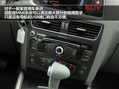 中控臺還是標準的奧迪風(fēng)格,各個功能分區(qū)明確,可以從中控面板上操作簡配版的MMI人機交互系統(tǒng),其實對于一般家庭用車來講,簡配版MMI系統(tǒng)可以滿足絕大部分的使用需求,只是沒有導(dǎo)航和USB接口有些不方便。