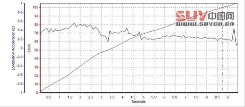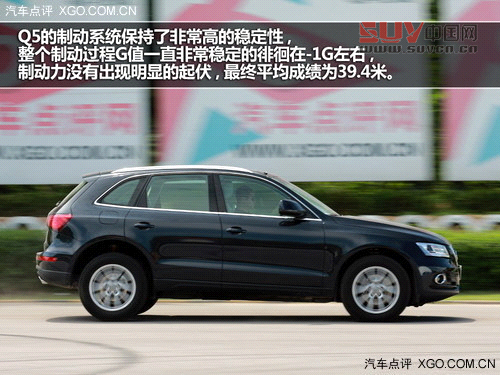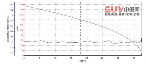 在100-0km/h制動測試中,Q5的制動系統(tǒng)保持了非常高的穩(wěn)定性,整個制動過程G值一直非常穩(wěn)定的徘徊在-1G左右,制動力沒有出現(xiàn)明顯的起伏,并且熱衰減現(xiàn)象也控制的很好,最終平均成績?yōu)?9.4米。