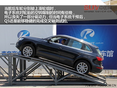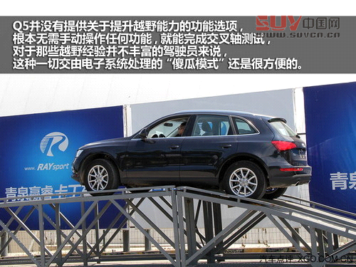 在交叉軸測試中,Q5的表現(xiàn)波瀾不驚,當(dāng)前后車輪分別駛上滑輪組時,電子系統(tǒng)對輪胎的空轉(zhuǎn)限制的時間有些晚,所以喪失了一部分驅(qū)動力,但當(dāng)電子系統(tǒng)干預(yù)后,Q5還是能夠穩(wěn)健的完成交叉軸測試的。Q5并沒有提供關(guān)于提升越野能力的功能選項,根本無需手動操作任何功能,就能完成交叉軸測試,對于那些越野經(jīng)驗并不豐富的駕駛員來說,這種一切交由電子系統(tǒng)處理的“傻瓜模式”還是很方便的。