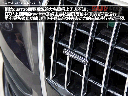 既然是豪華品牌的SUV,我們就不得不聊聊他們所搭載的四驅(qū)系統(tǒng),相信quattro四驅(qū)系統(tǒng)的大名算得上無人不知,在Q5上使用的quattro系統(tǒng)主要依靠前后軸中間的托森差速器,雖然并不具備鎖止功能,但電子系統(tǒng)會對偵測到失去動力的車輪進行制動干預(yù)。并且在換裝了8AT之后,變速箱對扭矩輸出的承受范圍也比雙離合更大,能夠展現(xiàn)出更強的越野性能。