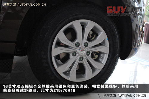 16英寸雙五幅鋁合金輪轂采用銀色和黑色涂裝,視覺效果很好,但是搭配碩大的車身,尺寸偏小,或許是為了突出越野車的氣質,輪胎采用韓泰品牌越野輪胎,尺寸為235/70R16,超高的扁平比在一定程度上提供了不錯的舒適性,并且行駛在惡劣路面時對輪胎起到了一定的保護作用。