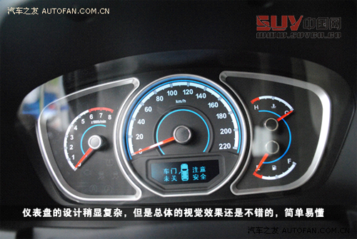 儀表盤的設計稍顯復雜,雖然周圍銀色裝飾想要表達一種運動氛圍,但是淺藍色的簡單字體實在不能將儀表盤提升什么檔次,紅色指針也稍顯陳舊,但是總體的視覺效果還算說得過去,簡單易懂。
