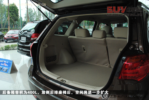 后備箱容積為400L,放倒后排座椅后,空間將進一步擴大。
