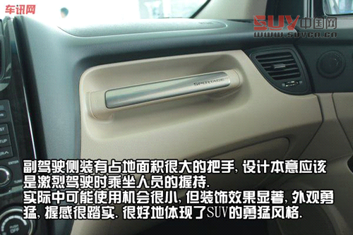 副駕駛側安裝了一個占地面積很大的把手,設計本意應為激烈駕駛時副駕駛乘客的握持,但實際使用中的使用機會會很小。不顧其裝飾效果還是顯著的,外觀勇猛握感踏實,很好地體現了獅跑的剽悍風格。