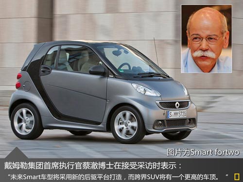 縱觀smart產品線,目前其只是推出了一款smart Fortwo車型。面對這樣的局面,蔡澈博士已經意識到了產品不夠豐富的情況,他在接受采訪時透露:“Smart公司未來推出的產品均將基于smart公司自行研發的后置引擎后驅平臺。采用該平臺將使得smart旗下的產品很好的與梅賽德斯-奔馳公司旗下的產品區分開來,并具有鮮明的特點?!蔽磥韺⑼懂a的smart 跨界車也將基于此平臺打造,并有望于2016年正式發布。