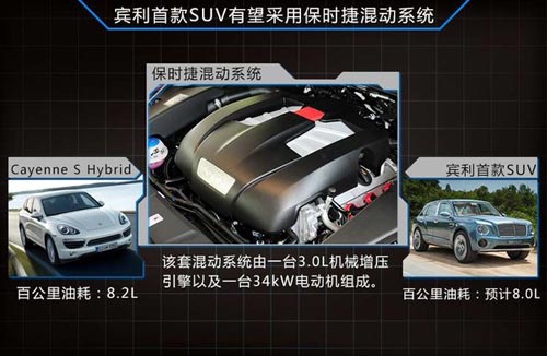 賓利作為大眾旗下的超豪華品牌,其有望采用同集團下的相關技術。其中在動力方面。賓利首款SUV產品作為一款混動產品或將與保時捷Cayenne S Hybrid采用相同的混動系統。該套動力裝置由一臺3.0L機械增壓發動機以及一臺34kW電動機所組成,總輸出功率279kW,綜合扭矩則達到了580N·m。而根據目前Cayenne S Hybrid所公布的8.2L百公里油耗,未來賓利首款SUV車型的油耗也預計在8L左右。對此賓利高層表示:“賓利也是大眾汽車的一員,在整個集團當中,我們也可以借鑒其他品牌先進的技術,包括技術方案,我相信通過大家的努力,可以打造出一輛最好的SUV。”