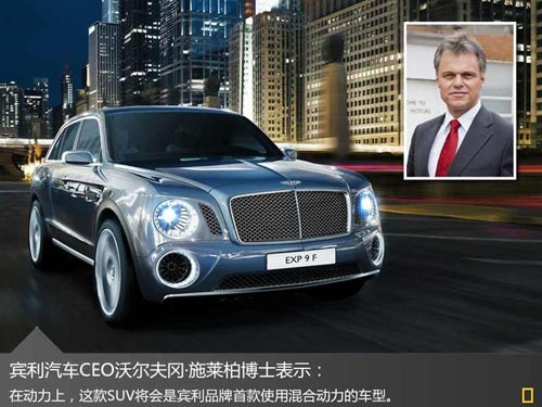 此前賓利發布了旗下首款SUV車型的“雛形”EXP 9 F概念車,根據賓利的相關規劃,該款全新產品有望在2016年正式上市。而關于該款新車型的相關信息,賓利汽車CEO沃爾夫岡·施萊柏博士還表示:在動力上,這款SUV將會是賓利品牌首款使用混合動力的車型。同時一位賓利高層也曾向網通社介紹到:我們一直想說造車肯定是能在環保層面上,對于用戶使用經濟效益上面,做出一點貢獻,我們當然愿意朝著這個方面來努力的。而記者了解到,該品牌首款SUV車型有望搭載由3.0L機械增壓發動機和電動機組成的混動系統,而根據目前上述車型8.2L的百公里油耗數據,未來賓利該款全新產品油耗也預計在8L/100km左右。