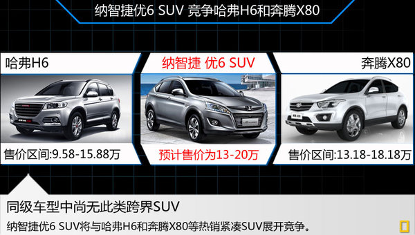 納智捷優(yōu)6無論在合資車型或是自主車型中,均沒有同類的SUV車型出現(xiàn)。待該車上市后,將與目前市場中的哈弗H6和大眾途觀等熱銷緊湊SUV車型展開競爭。據(jù)悉,該車有望于今年下半年上市,新車的預(yù)計售價將在13萬至20萬左右。