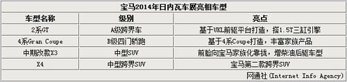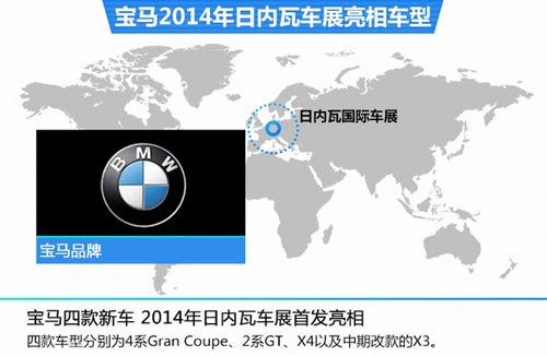 在今年1月份的底特律車展上,寶馬發(fā)布了如M3 Sedan、M4 Coupe在內(nèi)的多款新車,即將開幕的日內(nèi)瓦車展上(當(dāng)?shù)貢r(shí)間3月6日)寶馬將攜更多全新車型參展。記者為大家匯總了其即將參展的新產(chǎn)品,其中包括了2系GT、4系Gran Coupe、中期改款X3以及X4。在上述四款車型中,SUV已經(jīng)占據(jù)了總數(shù)量的一半。