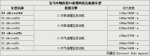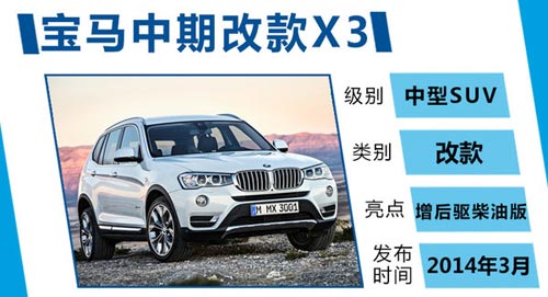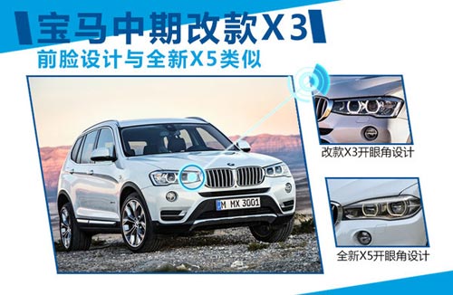 寶馬在今年春節(jié)期間發(fā)布了中期改款X3的官方圖片,新車在外觀設(shè)計(jì)上已經(jīng)趨向于最新的家族設(shè)計(jì),其開眼角式的前大燈與即將上市的全新X5保持著高度的相似。在動(dòng)力以及驅(qū)動(dòng)系統(tǒng)上,新車還增添了兩款后驅(qū)車型,分別為sDrive18d、sDrive20i,前者搭載了2.0T柴油增壓引擎,后者則繼續(xù)使用寶馬N20系列的2.0T低功率發(fā)動(dòng)機(jī)。
