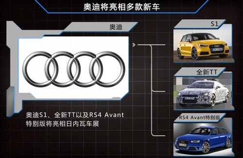 奧迪即將在日內(nèi)瓦車展首發(fā)的三款新車均有著各自獨(dú)特額亮點(diǎn),其中奧迪換代TT將采用最新的內(nèi)飾設(shè)計(jì)以及新MMI系統(tǒng);奧迪S1將基于A1雙門版打造,并將成為奧迪最入門的性能車型;而RS4 Avant限量版將是奧迪為紀(jì)念RS2 Avant而推出的一款產(chǎn)品,三款全新車型都將在今年年內(nèi)正式推向市場(chǎng)銷售。