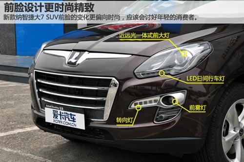 新款納智捷大7 SUV整體外觀依舊延續現款的設計風格,不過前后大燈、霧燈等細節之處都進行了全新的設計。前臉方面,前大燈燈組增加了LED日間行車燈,獠牙狀的霧燈框設計看上去更加時尚精致。