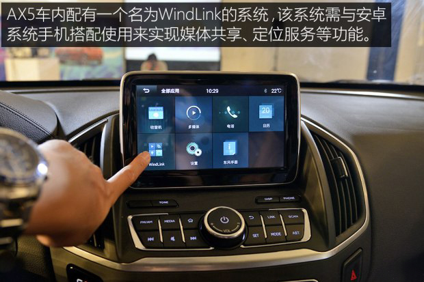 東風(fēng)風(fēng)神AX5的中控臺具有一定層次感,采用黑色和鍍鉻裝飾條進(jìn)行搭配,整體風(fēng)格中規(guī)中矩。配置方面,AX5的高配車型配備了獨(dú)立的8英寸液晶屏和一鍵啟動等配置,內(nèi)置的Windlink系統(tǒng)支持與安卓手機(jī)的連接。此外新車根據(jù)配置的不同還配備了后排空調(diào)出風(fēng)口、四門車窗一鍵升降,以及提供報(bào)警和救援等業(yè)務(wù)的語音服務(wù)功能等。