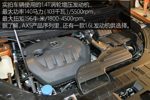 動力方面,東風(fēng)風(fēng)神AX5提供1.4T及1.6L兩款發(fā)動機(jī)供消費(fèi)者選擇,其中1.4T發(fā)動機(jī)的最大輸出功率為140馬力,峰值扭矩196牛·米,1.6L發(fā)動機(jī)最大功率124馬力,峰值扭矩153牛·米,傳動系統(tǒng)與1.4T發(fā)動機(jī)匹配的是5速手動及格特拉克生產(chǎn)的6速濕式雙離合變速箱,與1.6L發(fā)動機(jī)匹配的為5速手動變速箱。