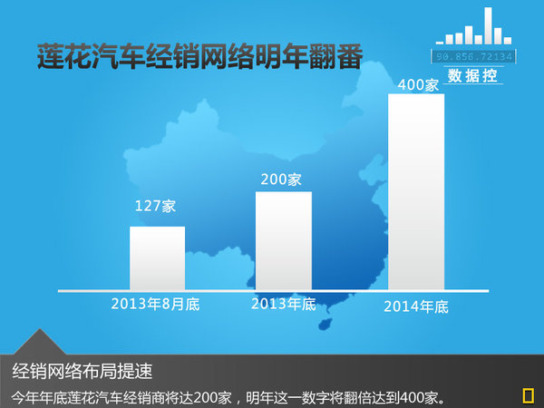 蓮花汽車在經銷商網絡方面的布局也值得關注,截至今年8月底蓮花汽車127經銷商,年底將將提升至200家,明年這一數字還會翻番。“經銷網絡布局方面,蓮花汽車要從省、市到縣全面鋪開”胡湘成在接受網通社采訪時表示:“2014年底底蓮花汽車經銷商將達到400家。”