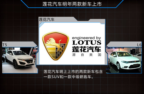作為蓮花汽車首款SUV,T5在2012年北京車展上首次亮相后引起各方關注。青年乘用車集團執行總裁胡湘成表示:明年蓮花汽車推出兩款新車完善產品陣容,這其中就包括 T5。對這款SUV蓮花汽車寄予眾望,此前蓮花汽車高層在接受采訪時表示:對T5的目標銷量一個月產銷一萬臺。另外一款于明年上市的新車L6定位于中級轎跑,新車將搭載2.0L發動機。