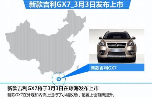 2013年吉利旗下全球鷹GX7成為國(guó)內(nèi)市場(chǎng)的熱銷(xiāo)SUV之一,全年銷(xiāo)售52,400輛,同比增長(zhǎng)67.4%,占據(jù)企業(yè)全年銷(xiāo)量近10%的份額。根據(jù)吉利汽車(chē)的產(chǎn)品規(guī)劃,未來(lái)全球鷹GX7計(jì)劃實(shí)現(xiàn)10萬(wàn)輛的銷(xiāo)量。為實(shí)現(xiàn)這一目標(biāo)GX7即將于今年迎來(lái)車(chē)型的升級(jí)改款,日前網(wǎng)通社從吉利官方獲悉,新款全球鷹GX7將于3月3日在瓊海博鰲上市。此外,我們?cè)谧咴L多家吉利全球鷹經(jīng)銷(xiāo)商后得知,新款GX7目前已接受預(yù)訂,新車(chē)起售價(jià)為9萬(wàn)元左右。